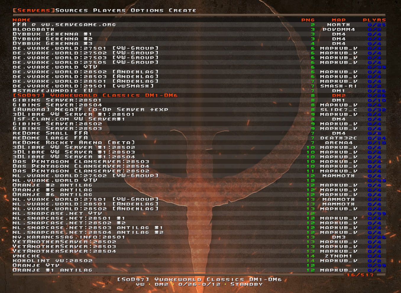 Wir haben einen Server für Free-for-All Deathmatch auf den klassischen Karten DM1 bis DM6 aufgesetzt. Hier verwenden wir die heute de-facto Standardserversoftware MVDsv/KTX. Der Server sod97.net:28501 meldet sich bei diversen Masterservern an und kann daher z.B. in geläufigen Clients wie nQuake bzw. eZQuake direkt aus dem Menü durch Suche nach "SoD97" ausgewählt werden.